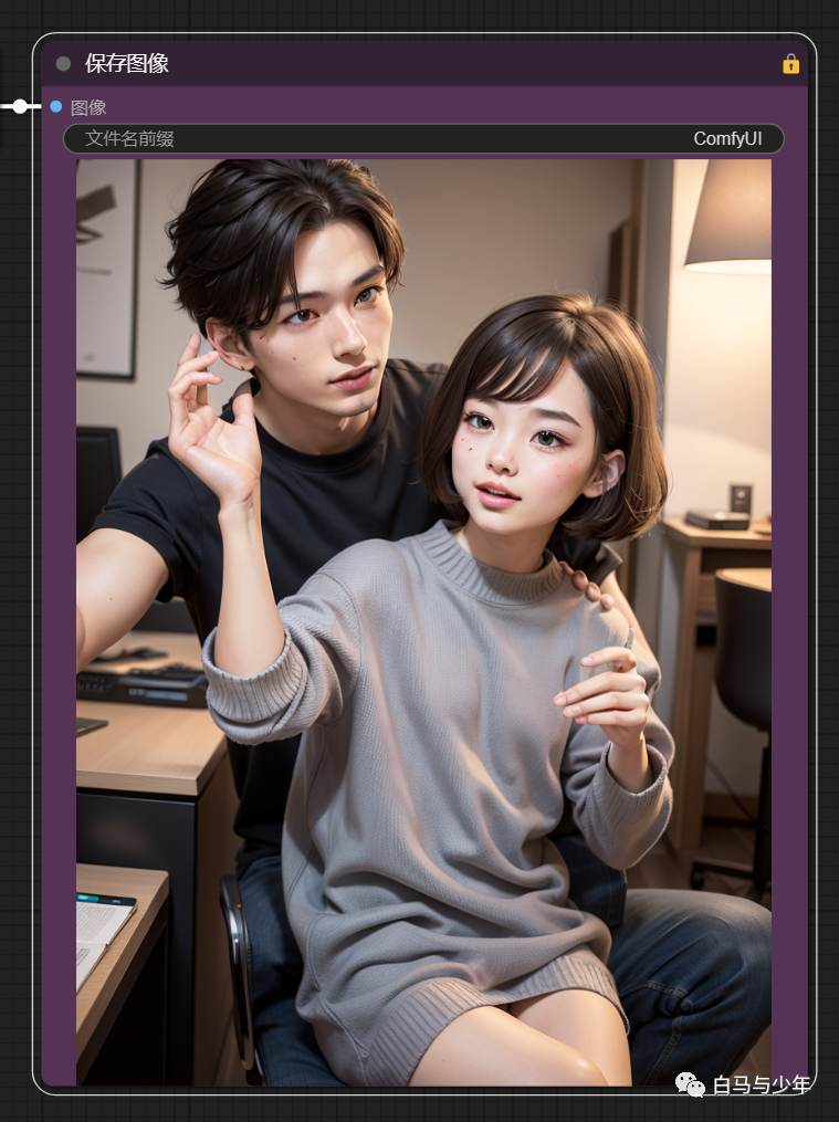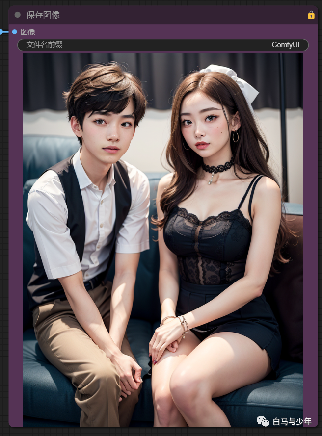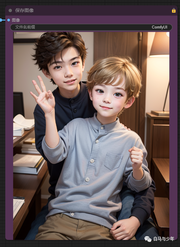 再试一次,这一次为了让对比更严谨一些,我们锁定随机种子。提示词设为“(1男孩:1.3),1女孩”,使劲强调男孩,但是也需要女孩出现,我们先使用comfyui自带的编码器来绘制一下。