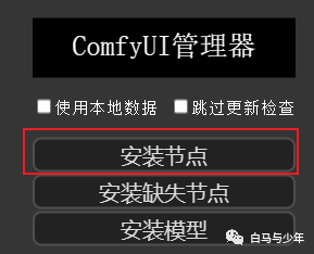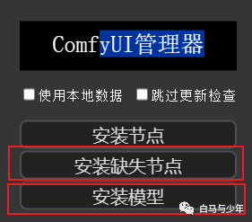如果使用别人的工作流,出现节点缺失的情况,可以点击“安装缺失节点”,需要模型的时候,还可以点击“安装模型”。