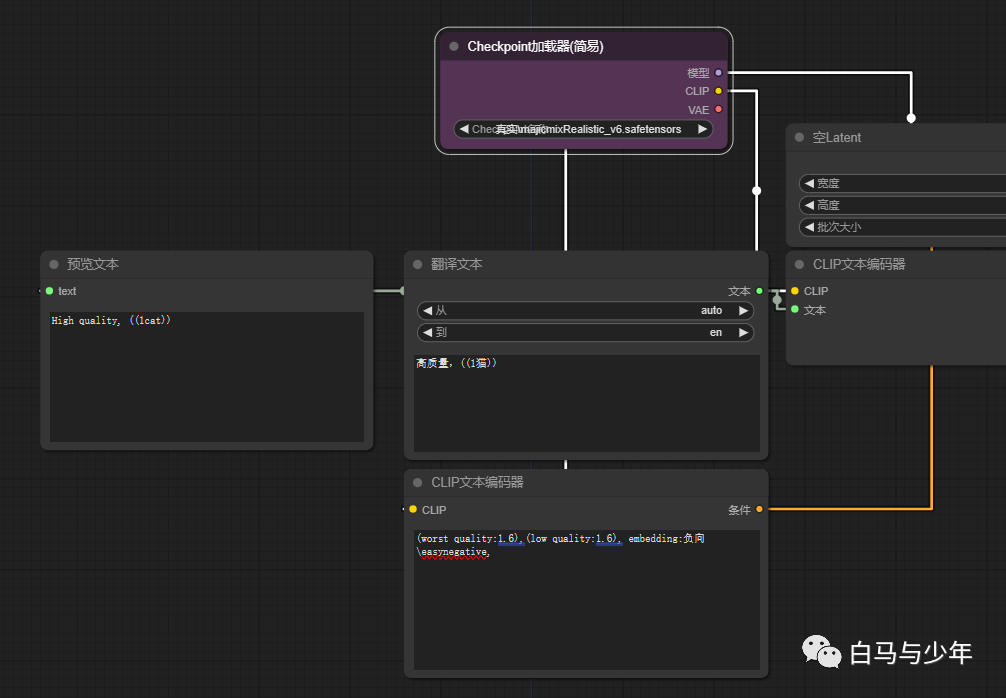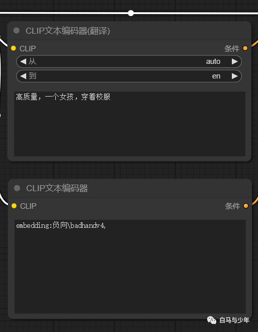【clip文本编码器(翻译)】可以代替自带的【clip文本编码器】,接下来直接输入中文就好了。需要注意的是,如果想要引用负向embedding的话,要确保你的文件夹路径中没有中文,不然它给你翻译一下之后路径就不对了。