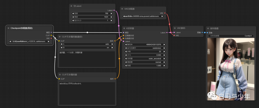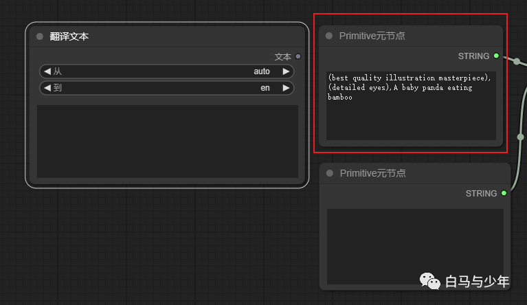我们使用一个简单的文生图流程,可以看到翻译信息是可以正确的传递到最终的输出的。