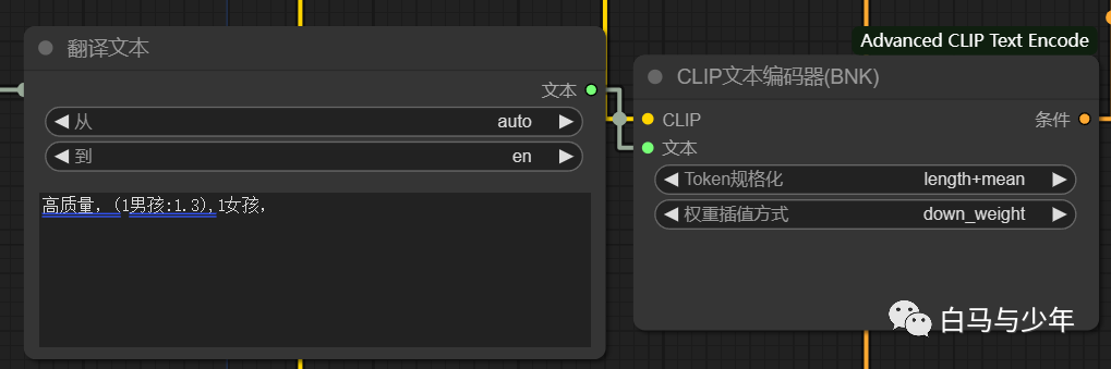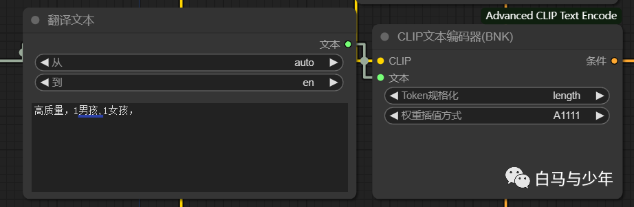 现在我们就编码器换成插件提供的高级编码节点,切换编码方式为“A1111”,也就是我们在webUI中常用的形式。