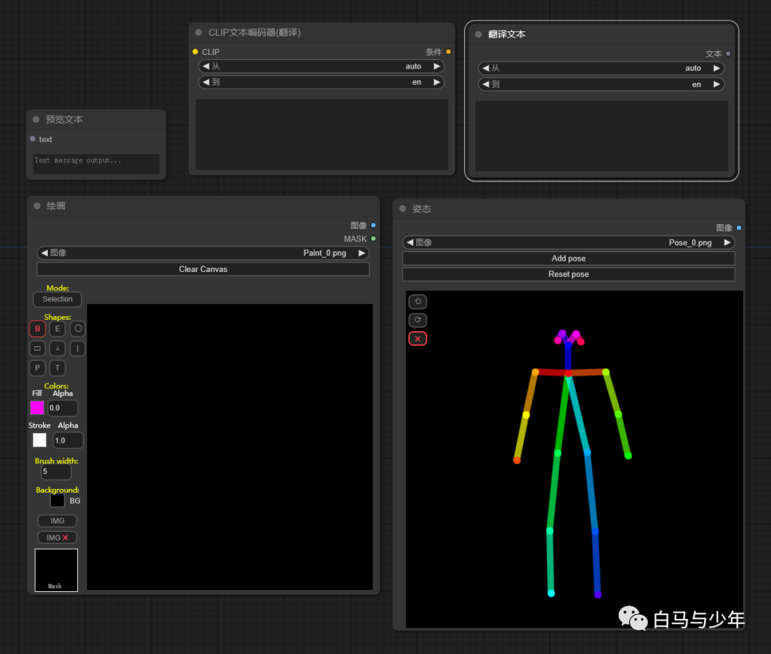 它一共包含了【预览文本】、【绘画】、【姿态】、【clip文本编码器】和【翻译文本】这五个节点。