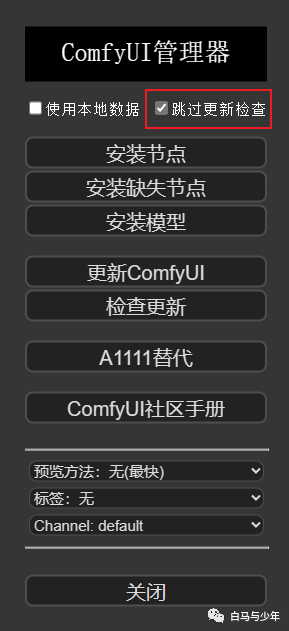 点开之后就能看到“ComfyUI管理器”的界面,“跳过更新检查”我们可以关掉,这样它就能帮我们自动检查是否有插件需要更新。