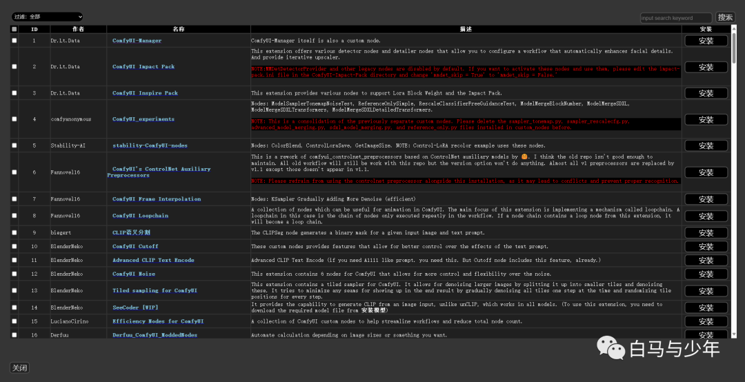 点击“安装节点”,可以进入到插件的管理界面。在这里,你可以下载到你需要的插件,如果插件有新版本,也可以在右边点击“更新”进行插件升级。