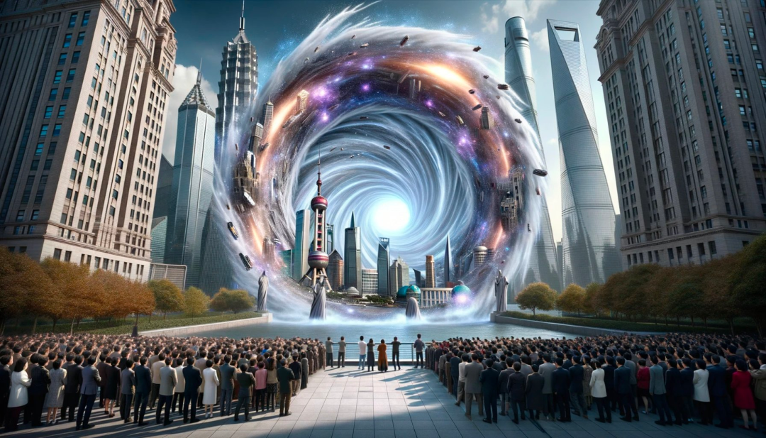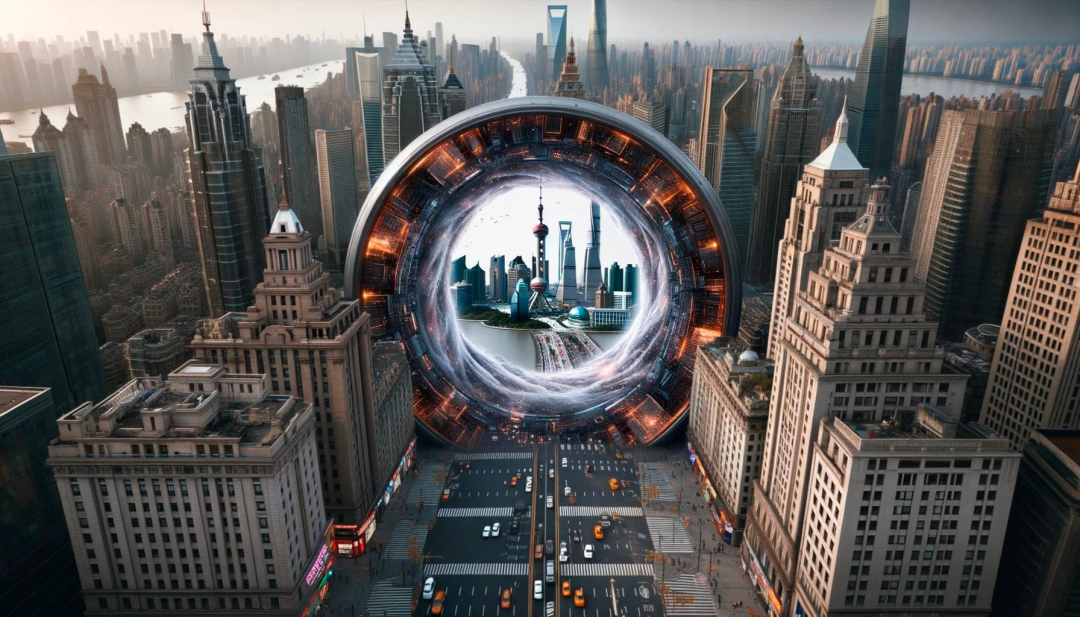 “在上海和纽约之间开启虫洞门户的就职典礼。纽约在门户内,上海在门户外。”