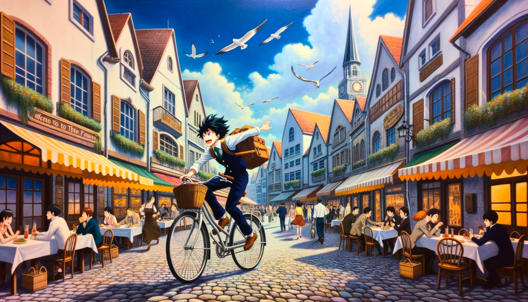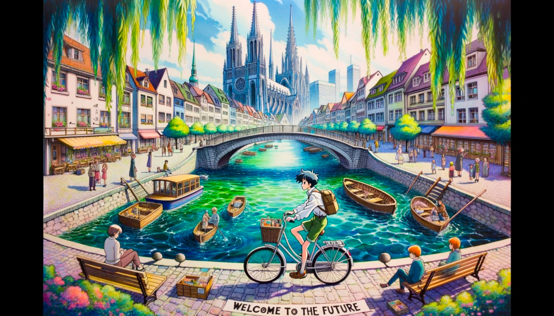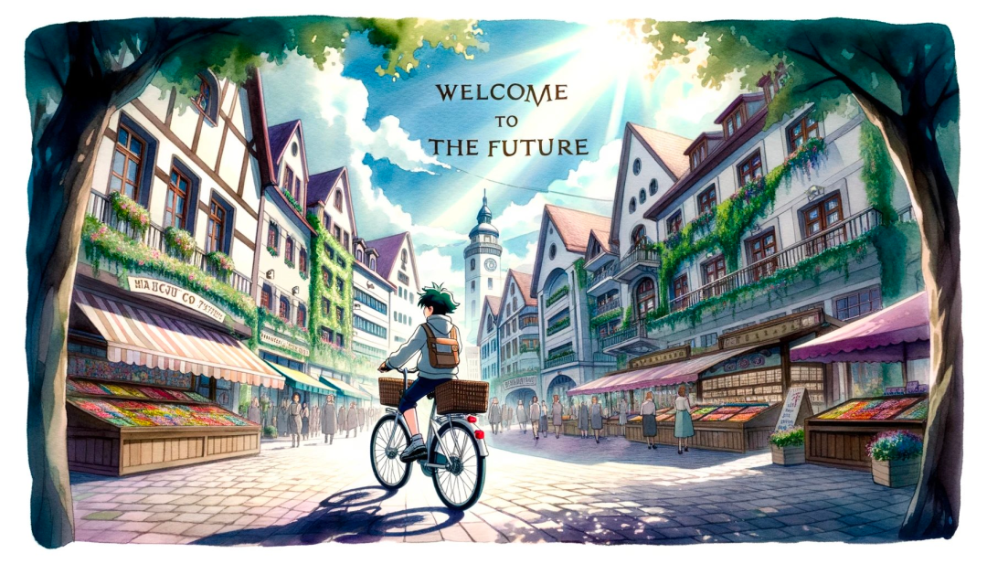 “吉卜力工作室动画风格,在乌托邦城市的阳光下骑自行车,文字写着- 欢迎来到未来”。