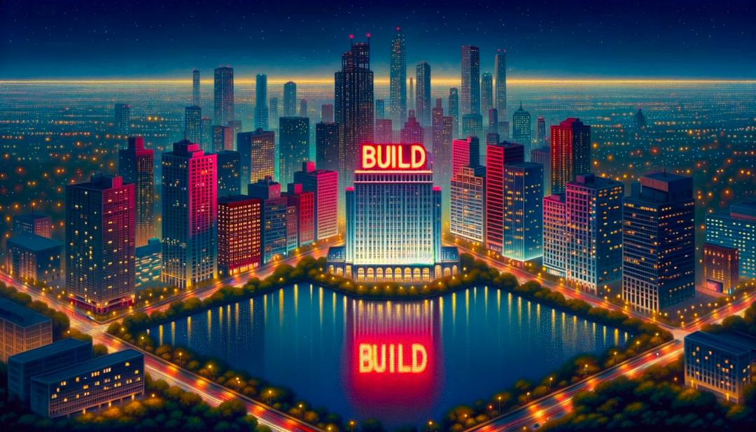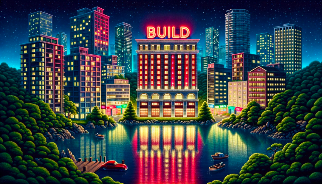 “夜晚繁忙的城市旁边有一个大湖,建筑物上的红色霓虹灯拍在湖面上反射出来 – 标牌上的文字写着’建造’,具有绘画感,插图风格,细节丰富”。