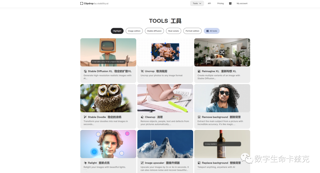 Stable Diffusion母公司Stability出的应用,集成了很多有趣的AI功能,包括去人去物体、增强、扣背景、重新打灯等等,方便快捷。很久之前也写过一篇文章介绍过: