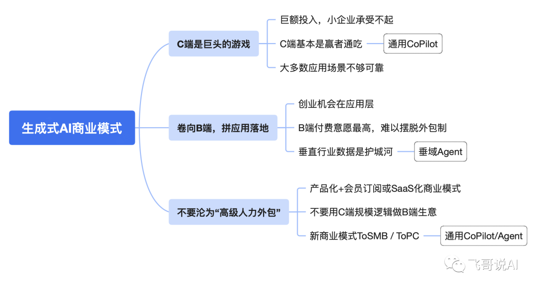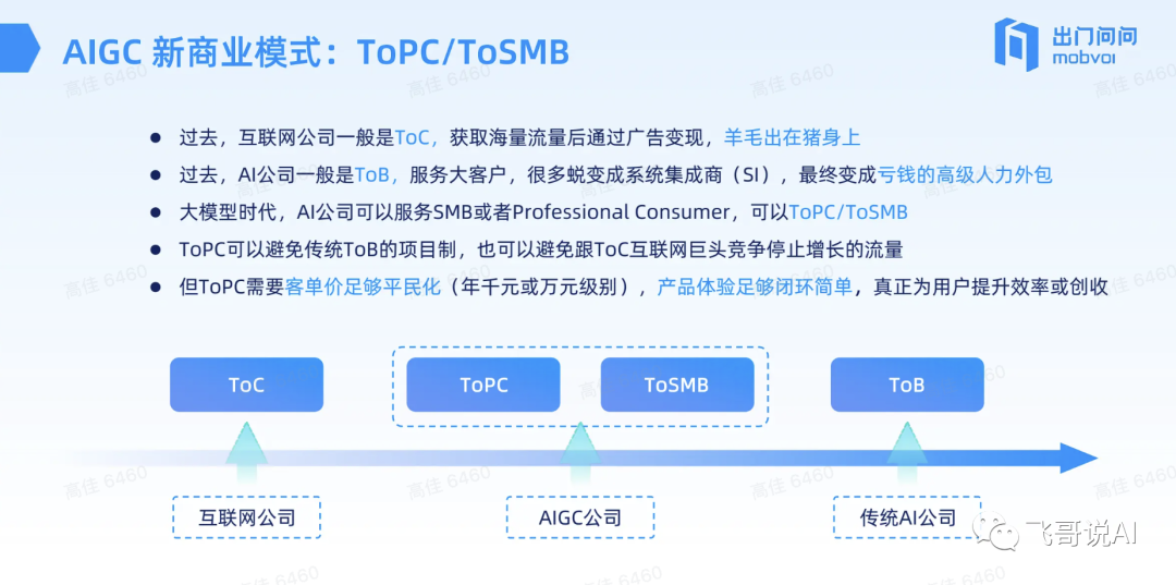 蒸汽机的发明,带来了轰轰烈烈的工厂制造;织布机的出现,开启了流水线生产的新模式。每一次技术变革,都带来新的商业模式的变迁,今天的大模型将带来何种商业模式呢?在大模型的加持下, AIGC 产品展现了强大的通用性,AI配音、AI写作、AI写作重塑广大创作者们的工作流。大模型的创业公司也根据技术、产品特点和用户属性,探索更多商业模式的可能性。如出门问问基于面向全球创作者的AIGC产品矩阵,开始尝试 ToPC/ToSMB 的商业模式。PC,即 Professional Consumer,专业的内容创作者用户,他们大多从事音视频、图文等内容创作,是各大创作平台的KOC/KOL。相比于纯粹的C端小白用户,PC端对 AIGC 产品有着更高的专业度需求,也有更高的付费意愿和能力,是介于浅度C端和深度B端之间的“灰度”用户群体。如在抖音、快手等各大音视频平台上被创作者们应用得极为广泛的AI配音产品——「魔音工坊」,因其丰富的AI声音和便捷的编辑功能深受创作者们喜爱,同时创作者们的使用数据和反馈,也在帮助产品不断优化。随着生成式AI的技术迭进,PC端相对专业的“作品”也将影响更多C端受众,或引领AIGC“全民创作新世代”。SMB,To Small and Medium Business,即小规模的企业级用户。SMB 既不完全属于consumer,也不完全属于enterprise,如小型企业的市场部对AIGC的产品需求,他们有明确的具体的「场景」,AIGC产品矩阵也可以一站式地完整覆盖这类相对通用的场景应用。出门问问在各AIGC产品端,布局企业级用户的协作功能,以赋能更多SMB用户,如「魔音工坊」加持团队协作功能,让企业级团队可以实现多人共创音频作品,真正做到AIGC产品的丝滑体验和高效生产。同时,ToPC/ToSMB 商业模式的优势在于,一方面能够避免上一代 AI 公司做ToB的项目制,沦为高级人力外包;另一方面可以避免跟互联网巨头竞争停止增长的流量。ToPC/ToSMB 是介于通用CoPilot和垂域Agent之间的模式,适应现阶段生成式AI的技术程度,也是现阶段较好的落地方式。而ToPC/ToSMB 的难点在于,在精准定位客户群体的基础上,需要客单价足够平民化(年千元或万元级别),产品体验足够闭环简单,可以真正为用户提升效率或创收。