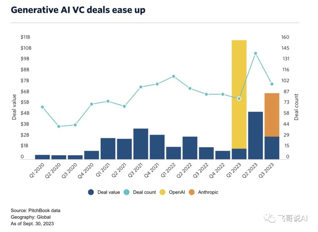 AIGC应用商业化进展方面,现阶段不少企业都推出了单独的定价方案,在试水不同的定价策略,但现在讲大模型在C端实现盈利还有点早,因为推出时间尚短,业绩未能得到有效验证。从媒体报道来看,大型科技公司如Microsoft、Google和OpenAI,仍在寻找如何从其AI产品中获得盈利。尽管OpenAI透露营收大大超出预期,但是并没有透露盈利情况。即使是巨头,也面临C端用户流失的尴尬境地。一开始,大模型厂商都寄望通过C端做大规模。随着新鲜感的逐渐消散,大模型的用户流失现象愈发严重,其专业性和商业性方面的缺陷也随之暴露无遗。以至于硅谷开始有传言称,生成式AI实际上并不有用。产品远远低于预期,这可以通过糟糕的用户留存率来证明。对许多应用的最终用户需求开始达到高潮,这只是另一个蒸汽泡沫周期吗?当然不排除泡沫的存在,当前投资机构对于生成式 AI 的热情开始降温。据数据机构 Pitchbook 10月6日公布的最新数据显示,2023年第三季度,全球生成式 AI 投融资交易数量下降至 101 笔,较二季度下降 29%。