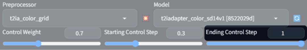 ending control step控制了controlnet在什么时候退出生图的步骤,越晚退出则会将影响保留的越完整,它意味着把控制留到的画面生成的最后一刻。