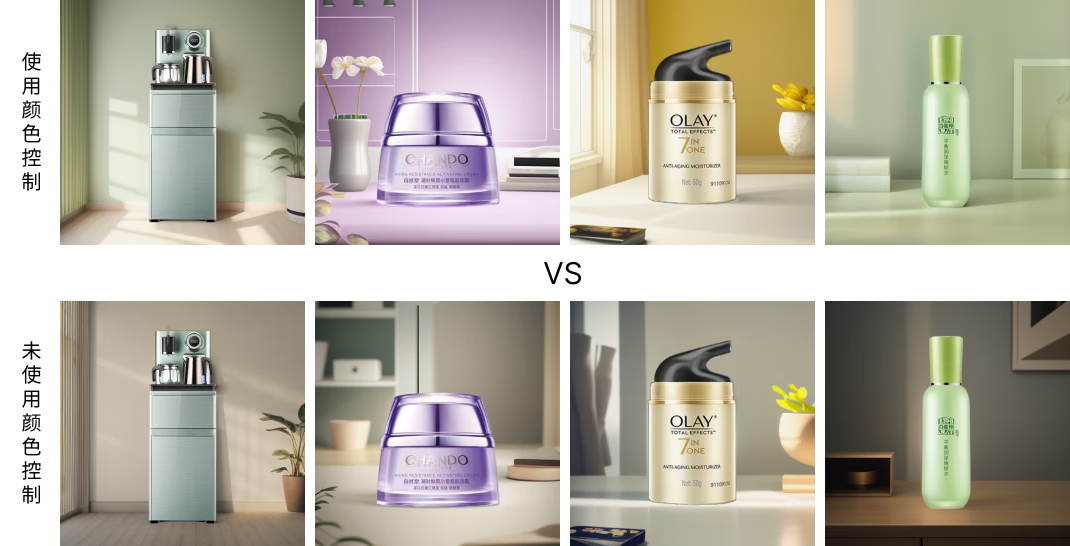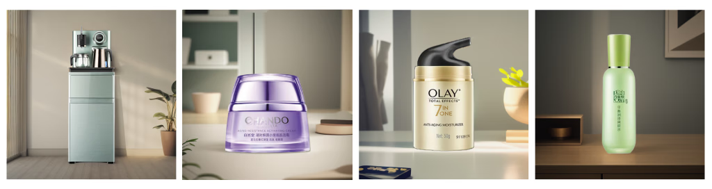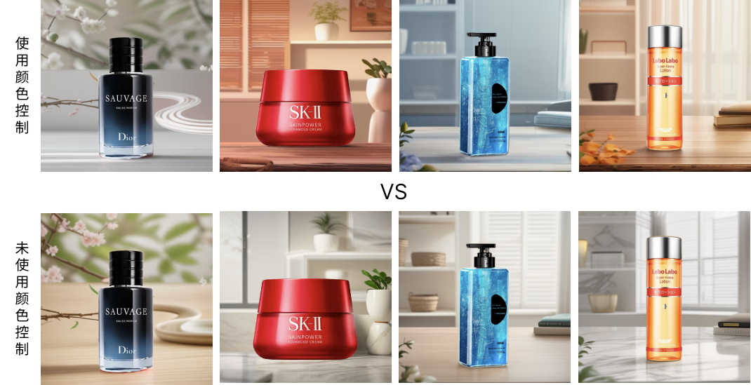 将这套流程应用到不同的商品和场景图中,实现如下效果。可以看到,经过颜色控制后,商品图的融合效果都有了显著提升。利用上述方法,设计师就能非常可控的来对图片进行颜色管理了,特别适合当商品本身色调鲜明多样,对放置的场景又有较高要求的需求中。