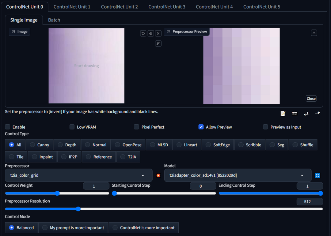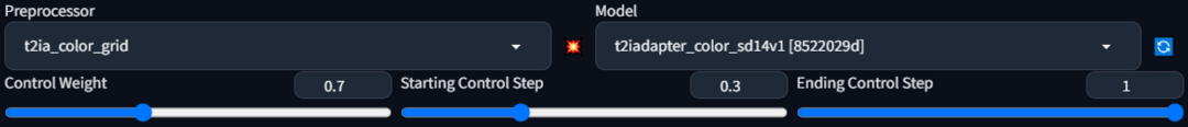 这一步是重点,它会完成色彩融合,在controlnet中,加载这张色彩渐变图片,并添加预处理器t2ia_color_grid和对应模型,具体的模型和参数会在后文有详细解读,这里我们先看效果。