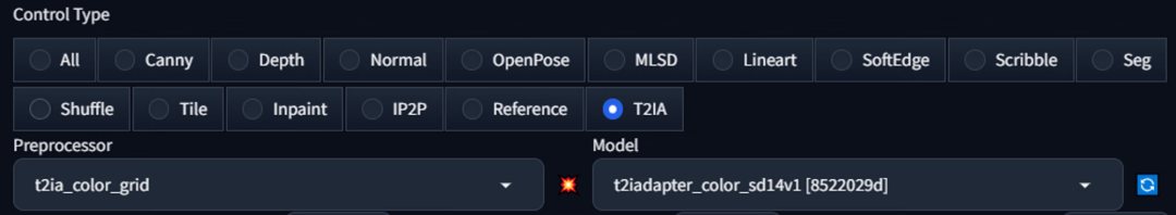 预处理器我们使用t2ia_color_grid,它的功能是对颜色进行网格检测,用来生成与原图色谱一致,分布近似的图像,所以它会呈现一个马赛克效果,在它的作用下,重新生成的图片会按照它的色彩特征进行重绘。(延伸思考:在一些特殊场景,你设置可以手绘一个颜色分布非均匀的模板,并以此产生更加丰富的效果)