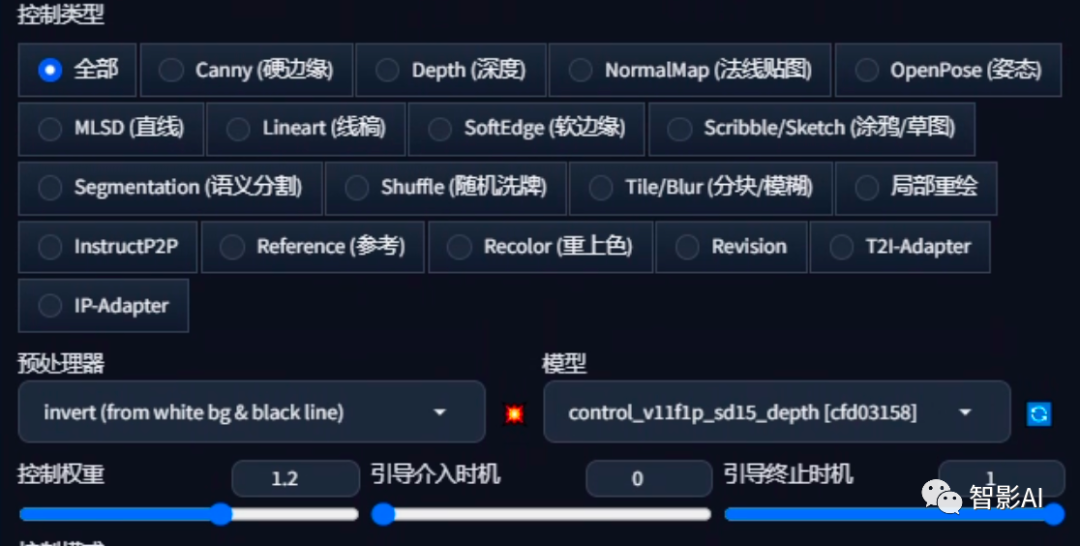 2. 在控制类型选择“全部”,预处理器选择“invert”,然后模型选择“control_v11f1p_sd15_depth”。