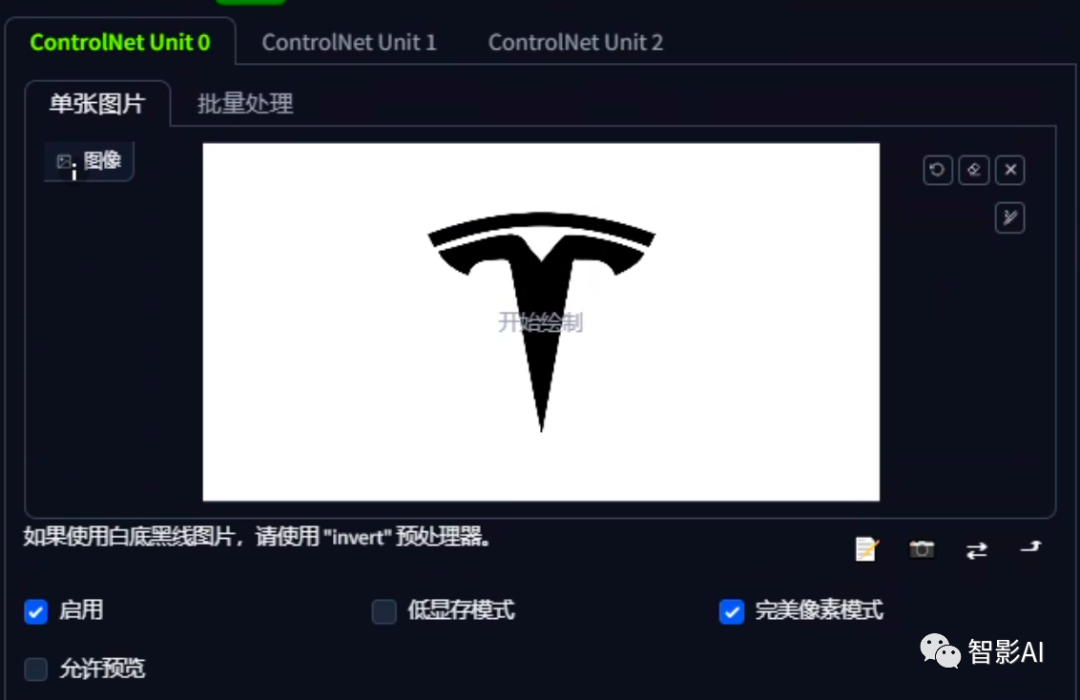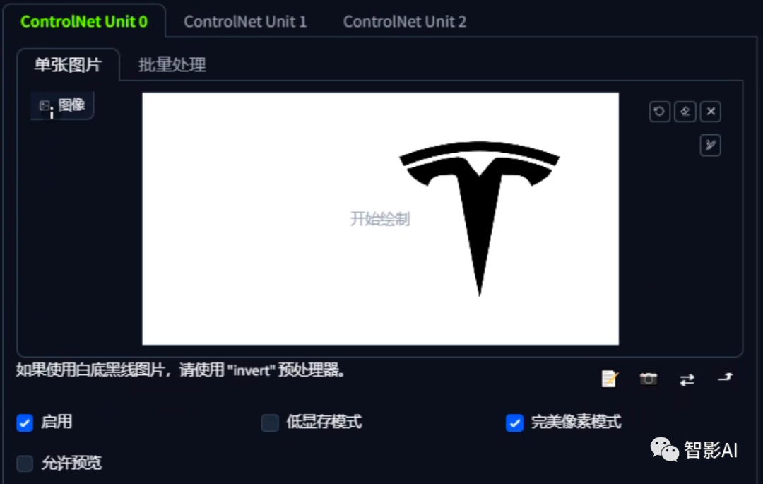 1. 打开“Stable Diffusion”,“启用”ControlNet,并勾选“完美像素模式”,然后上传刚刚准备好的Logo图片。