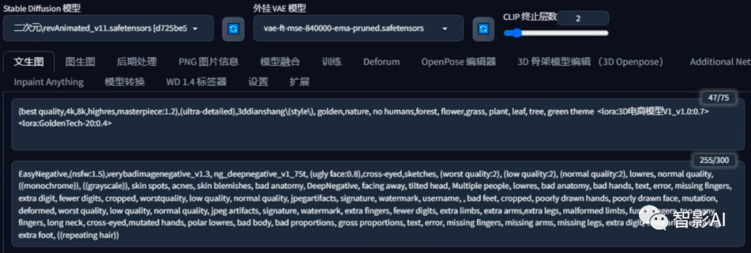 3. ControlNet设置好之后,选择一个大模型,然后输入正向提示词和反向提示词。