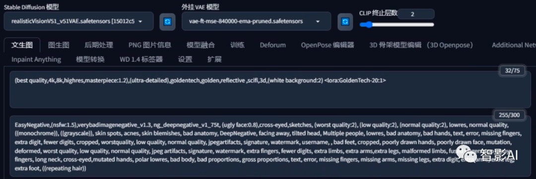这里大模型我选择了一个写实模型“realisticVisionV51”,然后用了一个黄金Lora“Golden Tech – World Morph”。